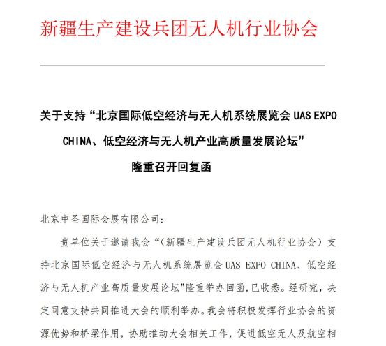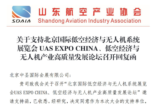 山东省航空产业协会回复支持北京国际低空经济与无人机系统展览会UASEXPOCHINA6月26-28日隆重召开