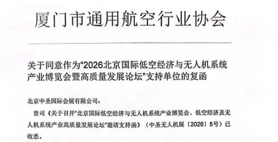厦门市通用航空行业协会关于同意作为"2026北京国际低空经济与无人机系统产业博览会暨高质量发展论坛"支持单位的复函