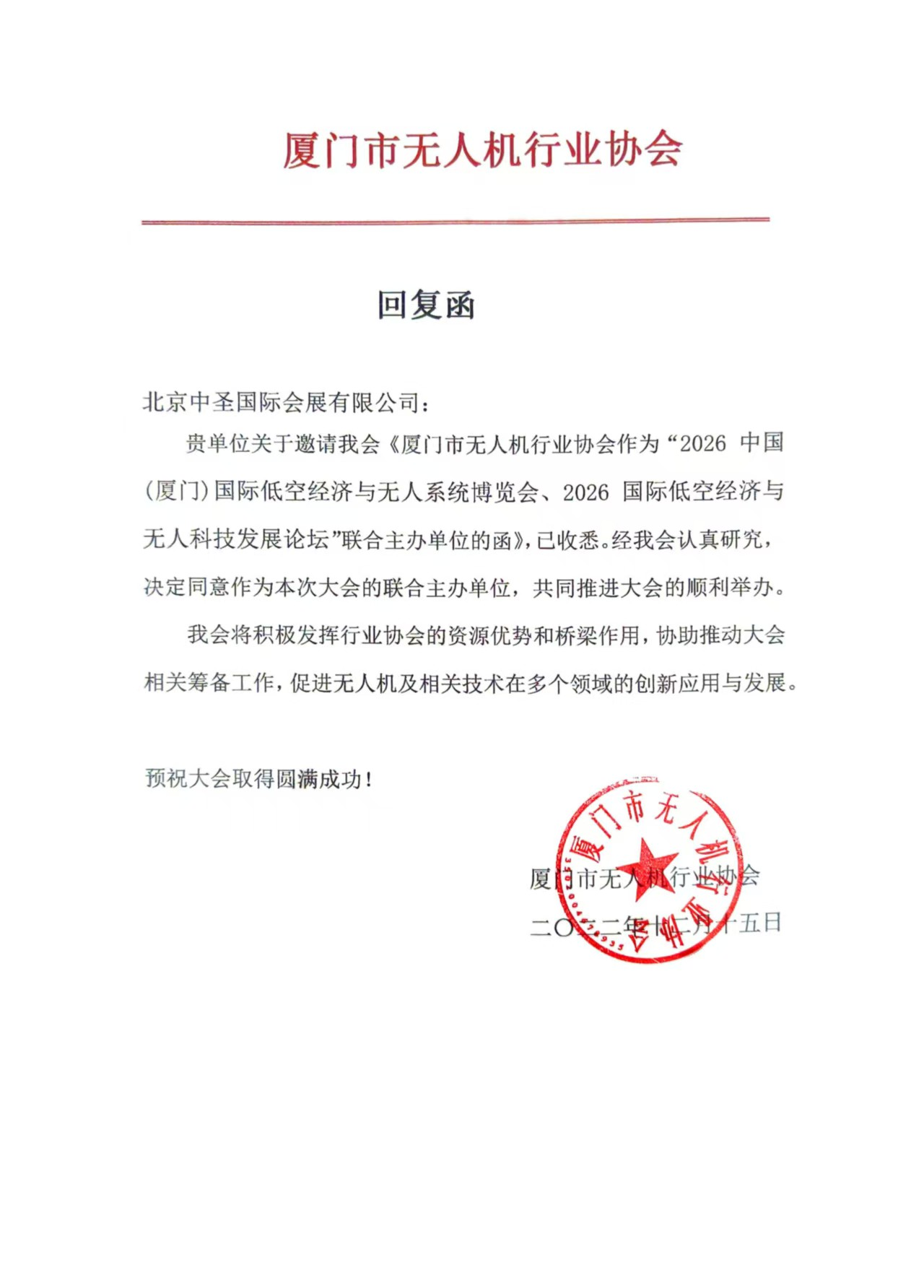 厦门市无人机行业协会回复函2026厦门国际低空经济与无人系统博览会UAS EXPO XIAMEN CHINA