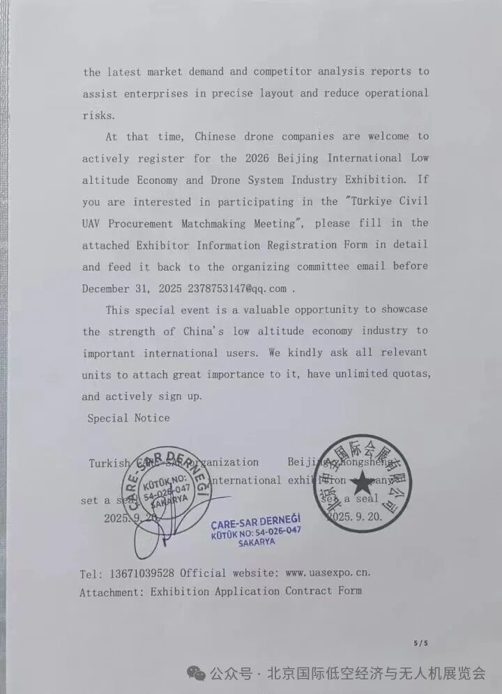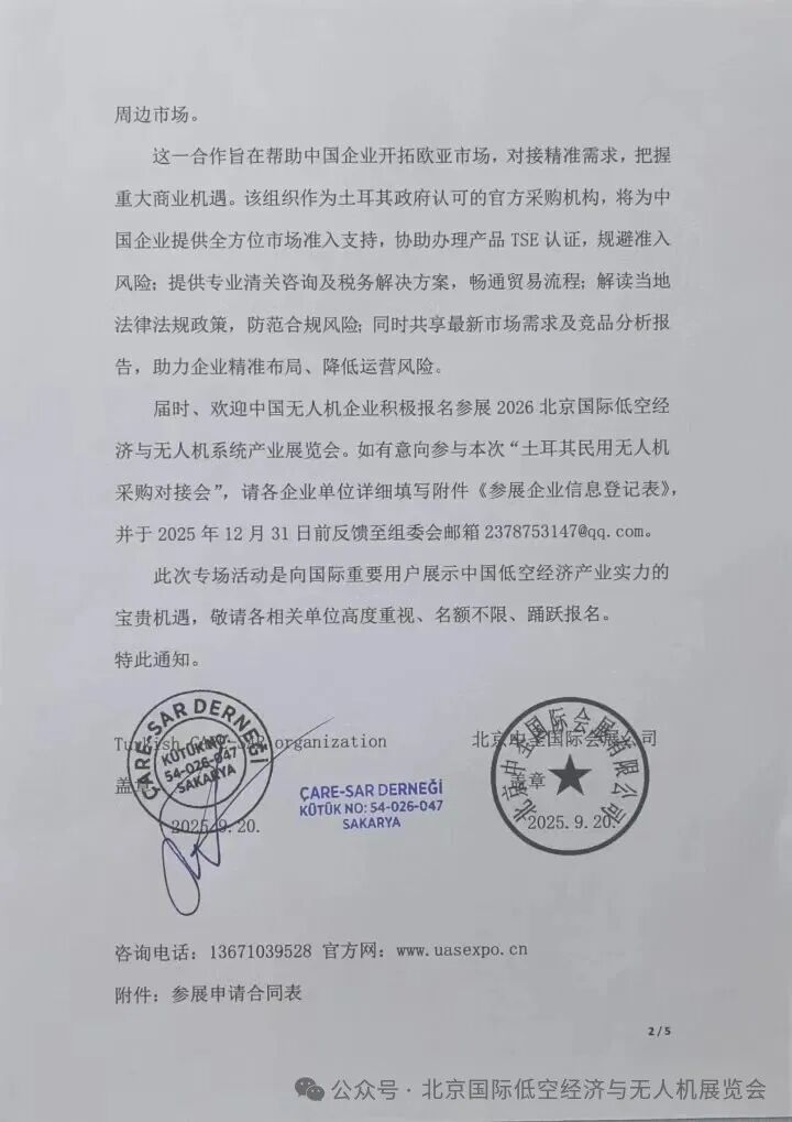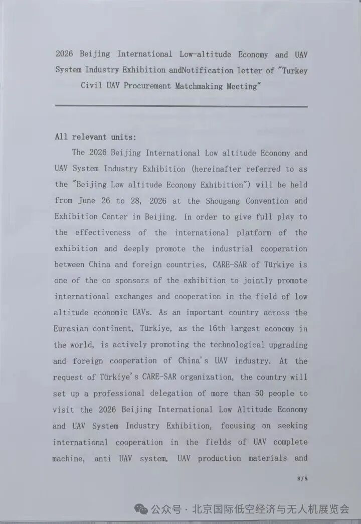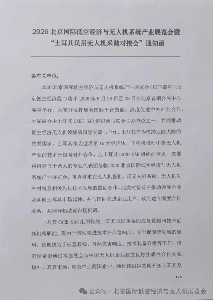 来源:低空经济无人科技网2026北京国际低空经济与无人机系统产业展览会(以下简称“北京低空经济展”)将于2026年6月26日至28日在北京首钢会展中心隆重举行。为充分发挥展会国际平台效能,深度促进中外产业合作,本届展会由土耳其CARE-SAR组织参与联合主办单位之一,共同推动低空经济无人机领域的国际交流与合作。土耳其作为横跨亚欧大陆的重要国家,土耳其作为世界第16大经济体,正积极推动中国无人机产业的技术升级与对外合作。应土耳其CARE-SAR组织的请求,该国将组建五十余人的专业代表团莅临2026北京国际低空经济与无人机系统产业展览会,重点寻求在无人机整机、反无人机系统、无人机生产材料及相关先进技术领域的国际合作。此次对接旨在推动参展企业业务向土耳其市场延伸,并与国际先进企业用户、政府建立深度合作关系,共同开拓欧亚市场机遇。