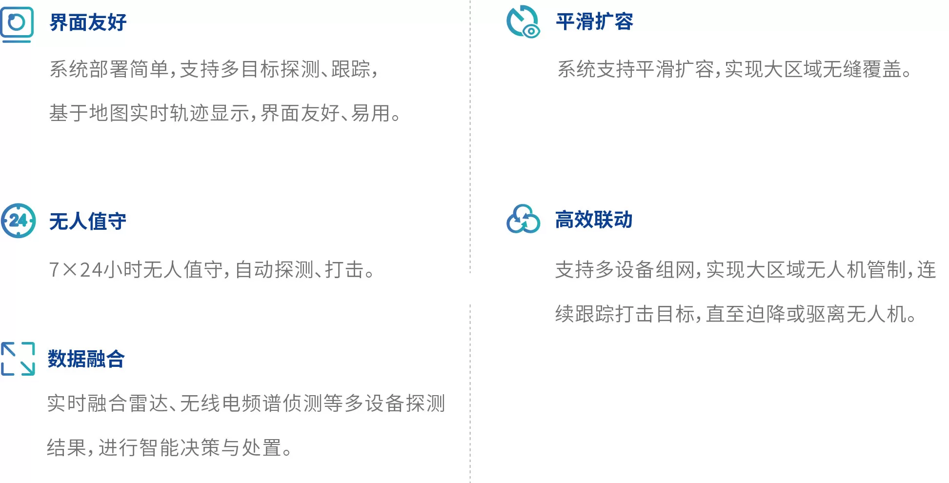 该系统不受气候条件影响,可全天候、全天时、全方位无人值守工作,安装方便高集成度,可以根据不同应用场景,选择不同的设备灵活搭配部署,适⽤于对公安特勤反恐、治安巡逻、重大安保等场景的安全防护,也可应用于部队、电力、石化等行业,构建起可感、可查、可打、可控的低空安全整体防控系统。