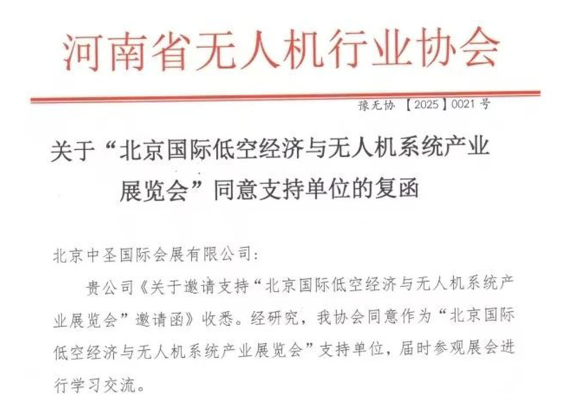 河南省无人机行业协会关于同意支持“北京国际低空经济与无人机系统产业展览会”的复函