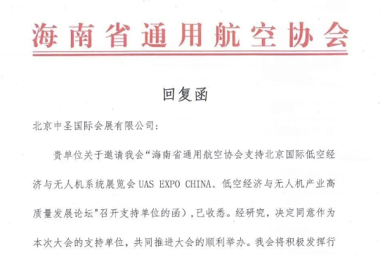 关于海南省通用航空协会支持北京国际低空经济与无人机系统展览会UASEXPOCHINA、低空经济与无人机产业高质量发展论坛"召开支持单位函