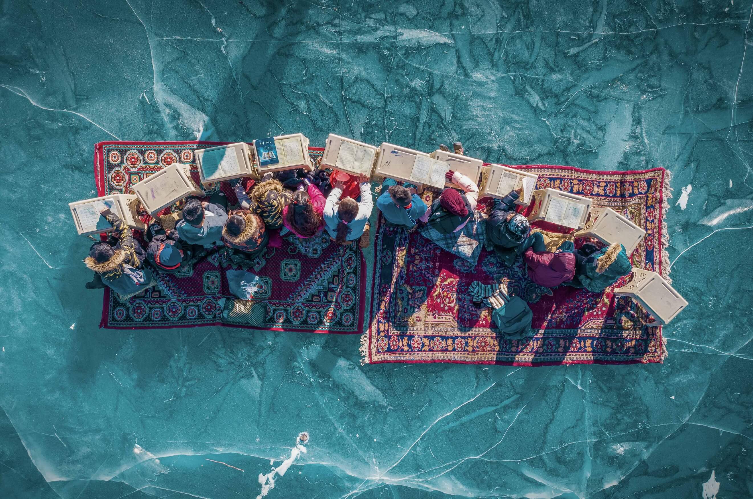 纪实摄影师 İsmail Kaplan 拍摄的《恰尔德湖冰上课堂》,将镜头对准了严酷寒冬中坚守求学的孩子们。在结冰的恰尔德湖面上,学生们聚集诵读经文。“信仰、传统与坚韧,在此冰封之境交汇相融”,摄影师在作品描述中写道。本届大赛评委、前《中国国家地理》首席摄影师姜平认为:“冷暖的色彩对比下,孩子们坐在如一叶方舟的地毯上,给人以想象的空间。” 知名策展人、北京电影学院影像传媒学院教授朱炯评价道:“寒冷的蓝色冰湖上一方热烈的红色地毯,为读书的孩子们烘托出温暖的天地。独特的大自然教室,不可思议。”该作品已入选本届大赛周度“社交媒体评选奖”。