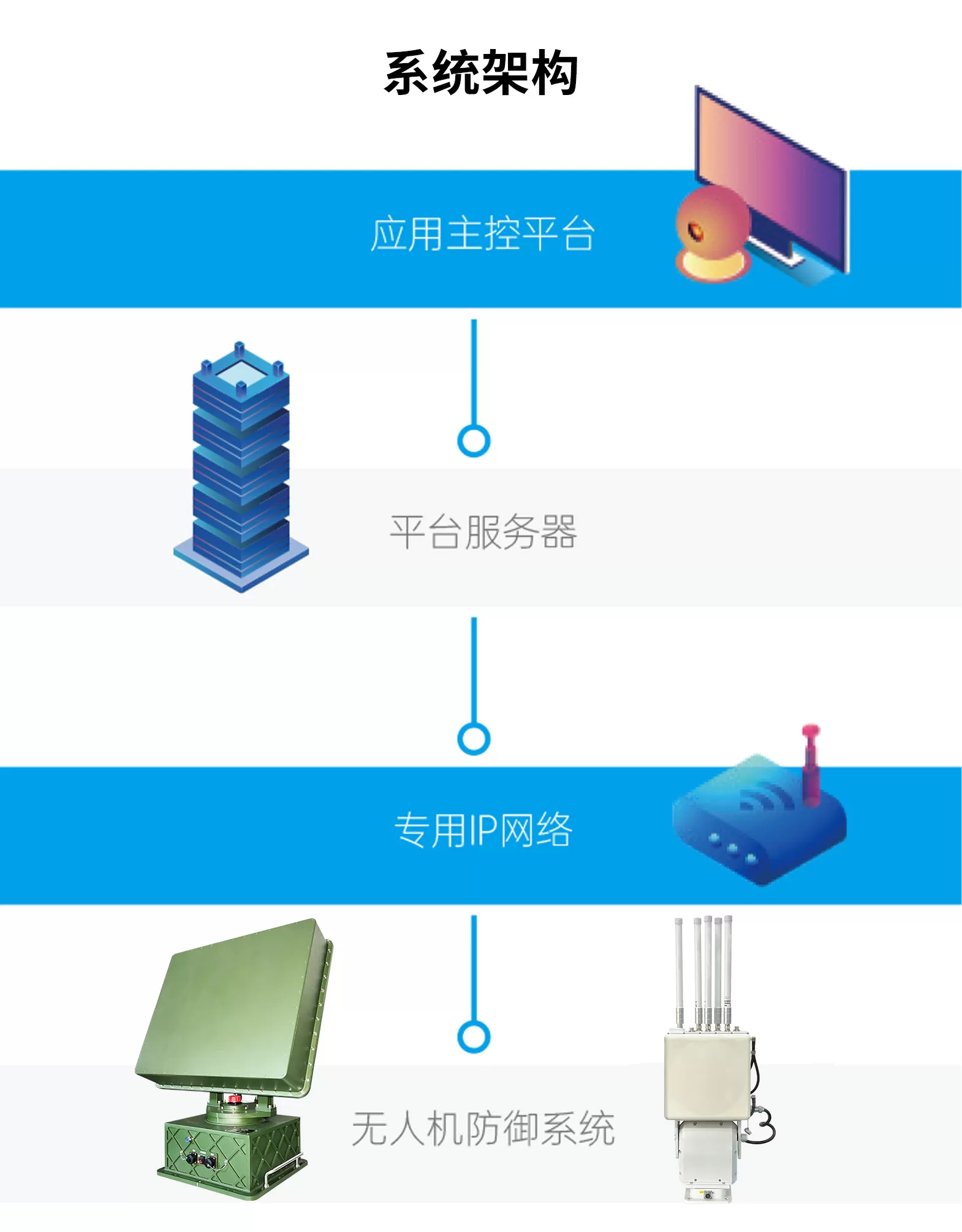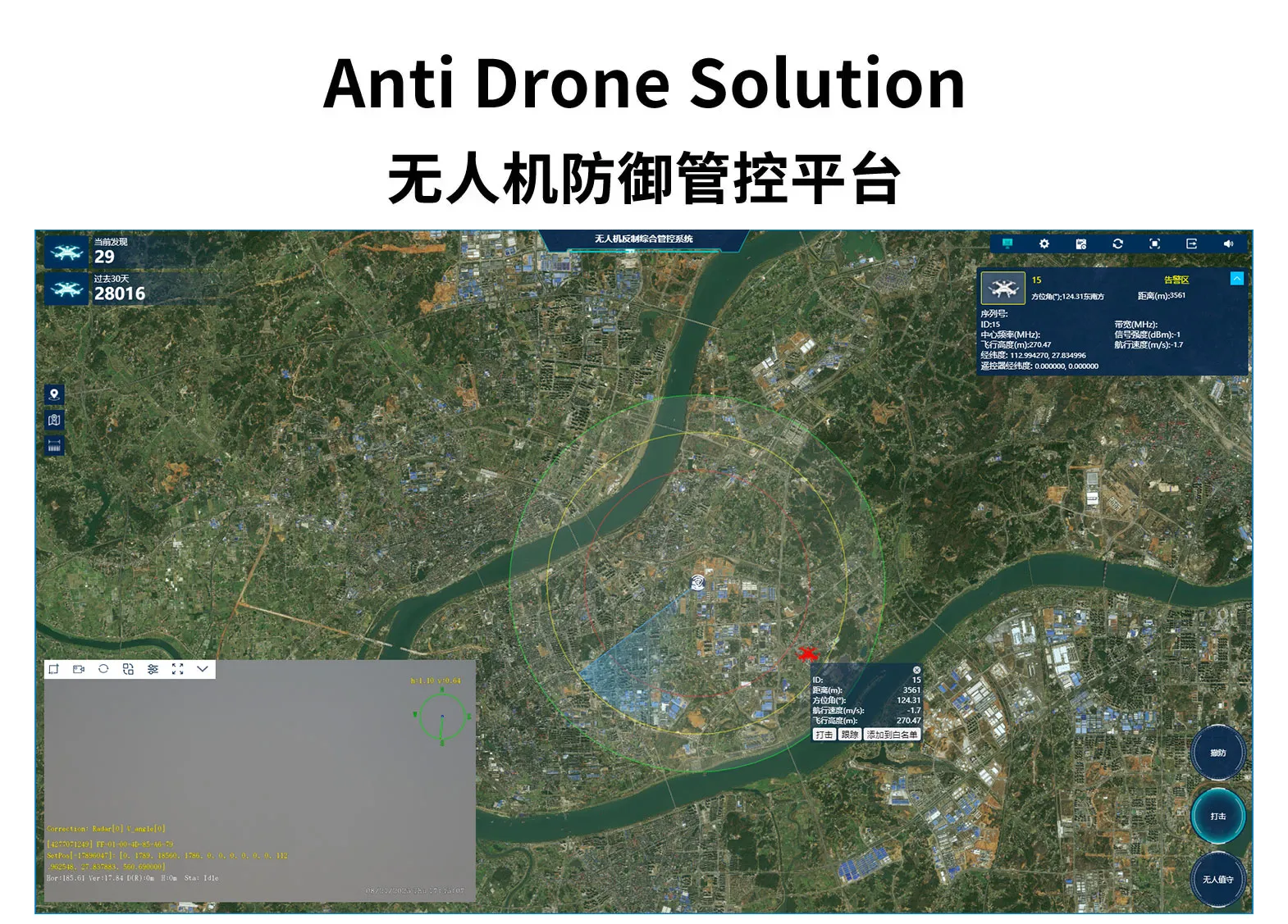无人机防御系统由无人机探测雷达、无人机侦测与反制设备、无线电侦测设备、光电识别跟踪设备、无人机导航诱骗设备、以及管控平台(可融入已有监控大屏)等组成,具备早期预警、侦测识别、跟踪定位和反制诱骗的无人机防御完整闭环功能。
